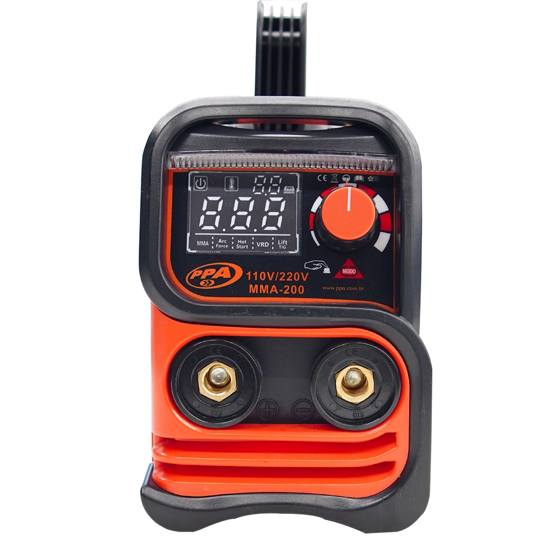 A máquina de solda PPA oferece desempenho e confiabilidade para aplicações profissionais, estando disponível nas versões bivolt automático e 220V. Possui ciclo de trabalho nominal de 60%, fator de potência 0,9, classe de proteção IP21S e classe de isolamento H, garantindo eficiência energética, segurança operacional e maior durabilidade mesmo em uso contínuo.